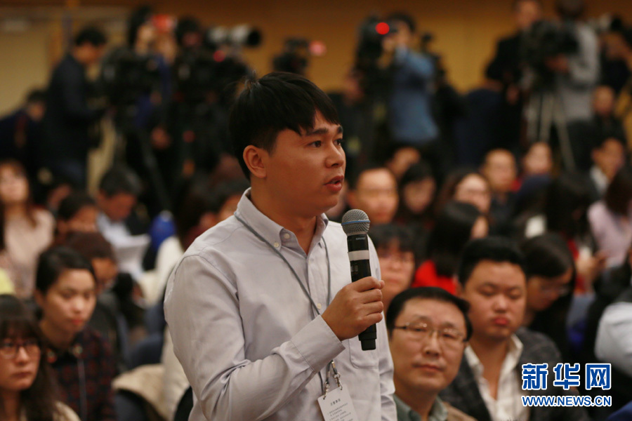 3月14日,十二屆全國人大五次會議新聞中心舉行記者會,邀請國家質檢總局局長支樹平、副局長兼國家認證認可監督管理委員會主任孫大偉、國家標準化管理委員會主任田世宏就“質量提升”的相關問題回答中外記者的提問。圖為光明日報記者提問。新華網/中國政府網 傅義洲 攝?