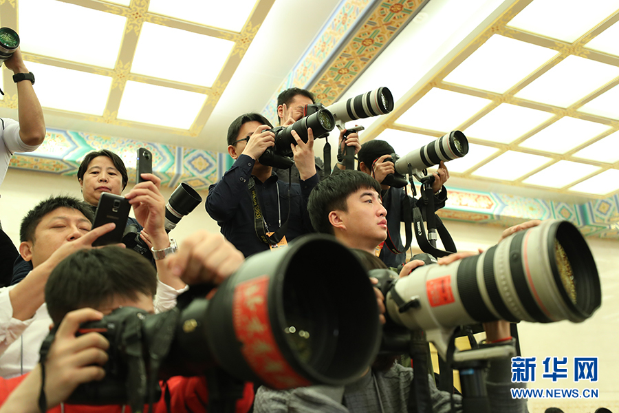 3月15日上午,國務院總理李克強在人民大會堂三樓金色大廳會見采訪十二屆全國人大五次會議的中外記者并回答記者提出的問題。圖為記者在現(xiàn)場拍攝。新華網(wǎng)/中國政府網(wǎng) 翟子赫 攝?