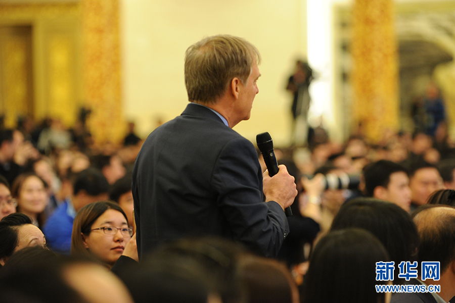 3月15日上午,國務院總理李克強在人民大會堂三樓金色大廳會見采訪十二屆全國人大五次會議的中外記者并回答記者提出的問題。圖為彭博社記者提問。新華網/中國政府網 翟子赫 攝?