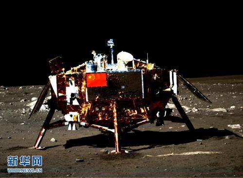 資料圖:嫦娥三號(hào)著陸器及器載五星紅旗圖片。該圖是由月球車上全景相機(jī)拍攝的。新華社發(fā)(國防科工局供圖) 圖片來源:新華網(wǎng)