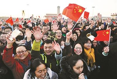 “再堅持一下,還有30分鐘。”太陽升起前氣溫低至-5℃至-6℃。在等待的人群中,大家相互鼓勵。7時25分,“中國,加油!”不知道誰在隊伍里喊了一句,緊接著,一陣又一陣的歡呼聲,一浪高過一浪,直到升旗儀式開始。