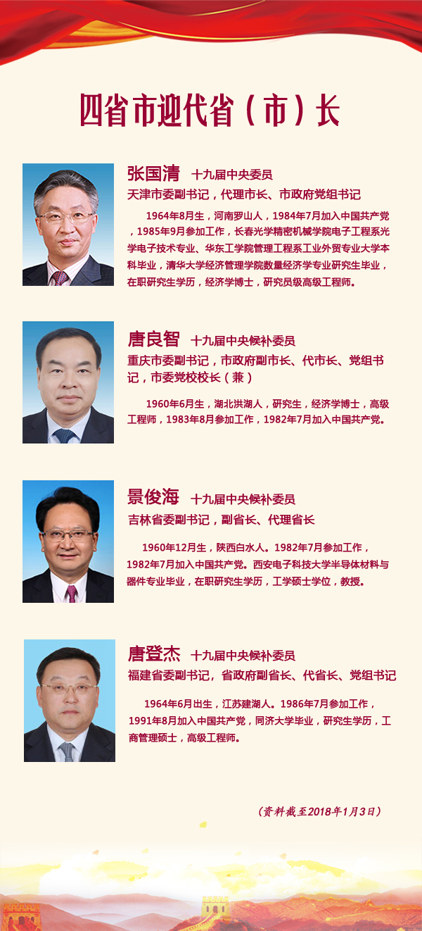 1月2日,天津、重慶、吉林、福建四省市調整政府“一把手”。其中,重慶市委副書記、市長張國清調任天津市委副書記、代市長;重慶市委副書記唐良智擔任重慶市代市長;北京市委副書記景俊海調任吉林省委副書記、代省長;工信部副部長、國家航天局局長唐登杰出任福建省委副書記、代省長。