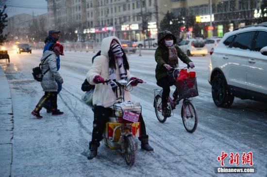 1月6日晚,內蒙古呼和浩特市迎來2018年首場降雪,路面濕滑,民眾出行受到一定影響。中新社記者 劉文華 攝