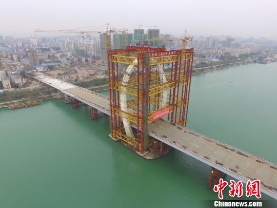12日,目前世界上跨度最大的“反對稱結構斜拉橋”廣西柳州市白沙大橋主塔在106米高空合龍,該大橋建設正式進入最后階段。