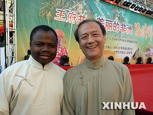 資料圖片:2006年10月31日,中國相聲演員丁廣泉(右)和他的非洲徒弟在王府井步行街參加非洲風(fēng)情節(jié)活動(dòng)時(shí)合影。
