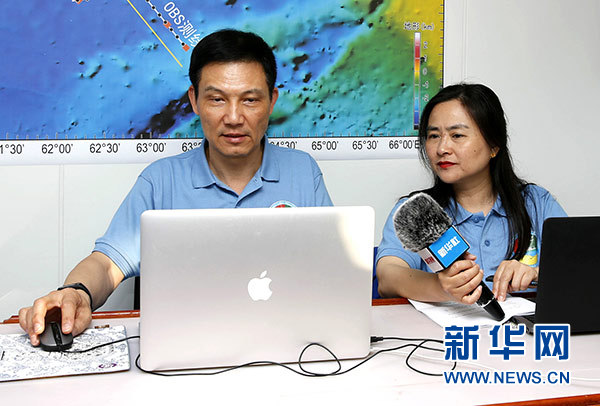 1月25日,中巴首次北印度洋聯合考察首席科學家林間(左)在“實驗3”號科考船上進行“海上科普”直播。新華社發