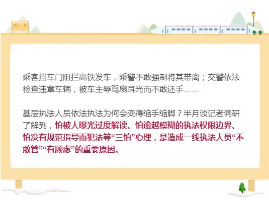 基層執(zhí)法人員依法執(zhí)法為何會(huì)變得縮手縮腳?半月談?dòng)浾哒{(diào)研了解到,怕被人曝光過(guò)度解讀、怕逾越模糊的執(zhí)法權(quán)限邊界、怕沒(méi)有規(guī)范指導(dǎo)而犯法等“三怕”心理,是造成一線執(zhí)法人員“不敢管”“有顧慮”的重要原因。