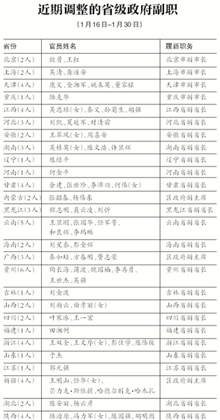 記者注意到,從1月16日開始的省級(jí)政府副職調(diào)整共涉及27省份,1月16日至24日這一批省級(jí)政府副職調(diào)整,共涉及23個(gè)省份,4大直轄市均有調(diào)整。26日至30日,經(jīng)過(guò)省級(jí)人大會(huì)議選舉,37位“本土派”副省長(zhǎng)當(dāng)選。