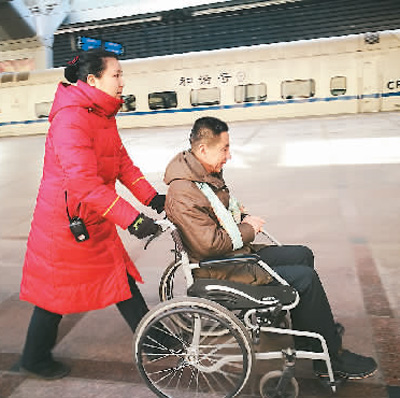 來自黑龍江齊齊哈爾的趙大哥在北京站工作人員幫助下進站。葉聰 攝