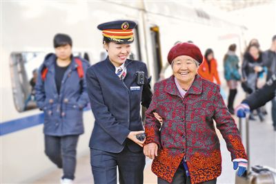 沈陽鐵路部門采取多項(xiàng)新舉措,溫暖旅客回家路。圖為日前吉林至北京D74次列車長劉露攙扶行動不便的老年旅客乘車。