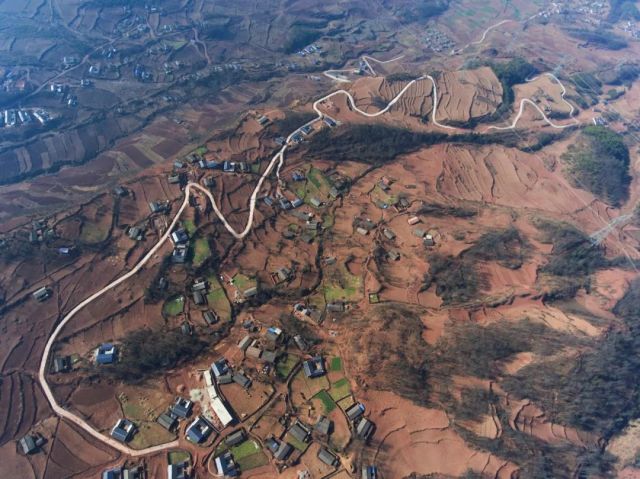 涼山彝族自治州美姑縣九口鄉四峨吉村6.3公里道路硬化項目從空中看來格外耀眼(2017年2月12日攝)。新華社記者劉坤攝