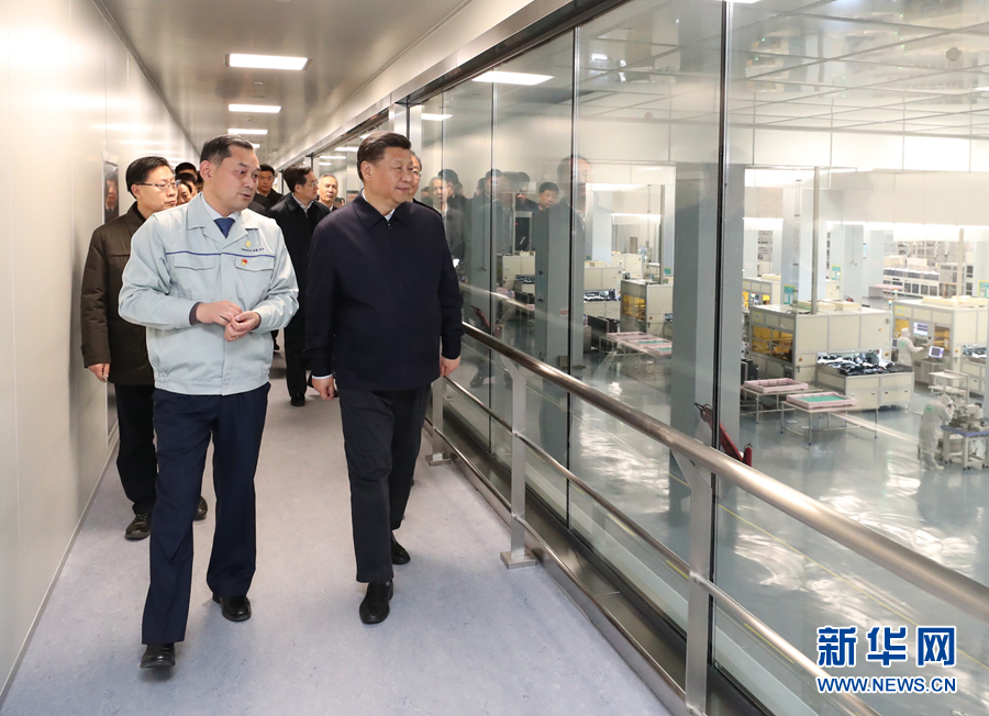 這是2月11日下午,習近平在成都中電熊貓顯示科技有限公司考察。 新華社記者 謝環馳 攝