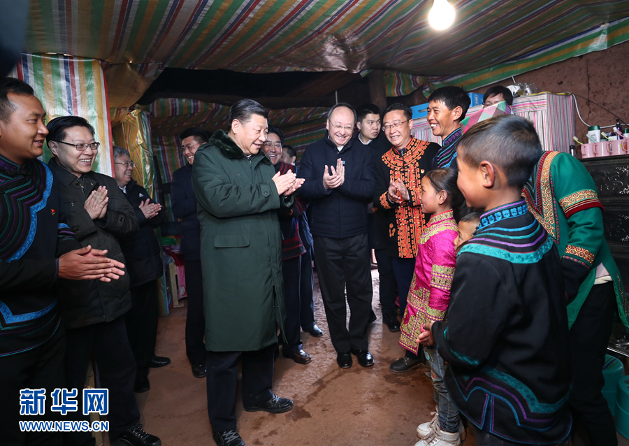 這是2月11日上午,習近平在涼山彝族自治州昭覺縣三岔河鄉三河村貧困戶吉好也求家中看望,聽10歲小女孩吉好有果唱《國旗國旗真美麗》。新華社記者 鞠鵬 攝