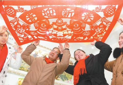 圖二 2月15日,在安徽省阜陽市臨泉路白衣橋安置區內,安置戶董杰珍(前一)和當地剪紙藝術家一起將喜慶窗花張貼到窗戶上。王彪 攝(人民視覺)