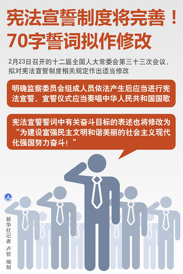 新華社北京2月23日電(記者陳菲、王琦)23日召開的十二屆全國人大常委會第三十三次會議,擬對憲法宣誓制度相關規定作出適當修改,明確監察委員會組成人員依法產生后應當進行憲法宣誓、宣誓儀式應當奏唱中華人民共和國國歌。憲法宣誓誓詞中有關奮斗目標的表述也將修改為“為建設富強民主文明和諧美麗的社會主義現代化強國努力奮斗!”
