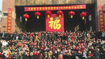 近四米見方的大紅“福”字懸掛在舞臺中央,上面是寫有“河順鎮王家溝居民委員會2018年春節全村福”的大紅條幅。這樣喜慶的背景下面,是700多人笑逐顏開的臉。2月16日,大年初一,河南林州河順鎮王家溝村村民們拍了全村有史以來的第一張全村福。
