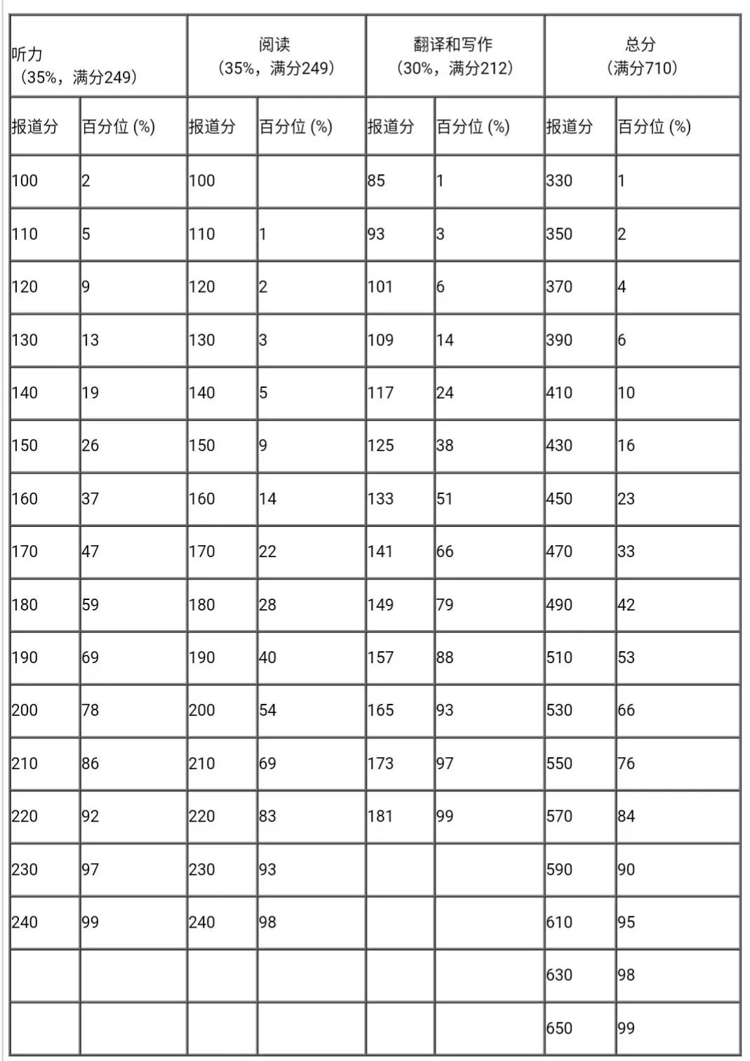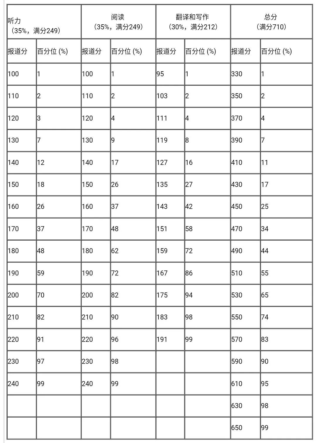 每次考試等值后的卷面分數都參照常模轉換為報道分。四、六級考試報道總分為710分,計算公式為: