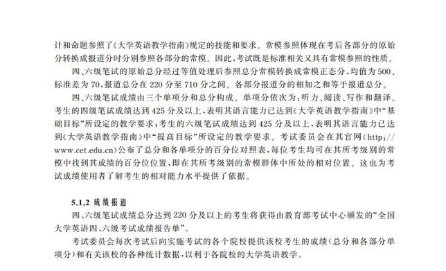 中國青年報(ID:zqbcyol)注意到,《全國大學生英語四、六級考試大綱》(2016修訂版)顯示,“考生的四級筆試成績達到425分及以上,表明其語言能力已達到《大學英語教學指南》中‘基礎目標’所設定的教學要求;考生的六級筆試成績達到425分及以上,表明其語言能力已達到《大學英語教學指南》中‘提高目標’所設定的教學要求。”