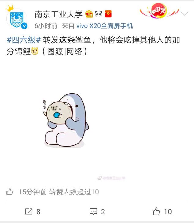然而!南京工業大學官方微博不走尋常路,轉發鯊魚,吃掉其他人的錦鯉: