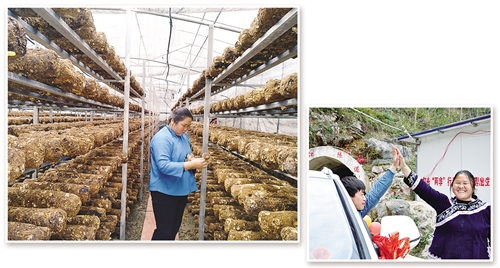 左圖 鄧迎香在香菇大棚查看菌棒。 肖家云攝