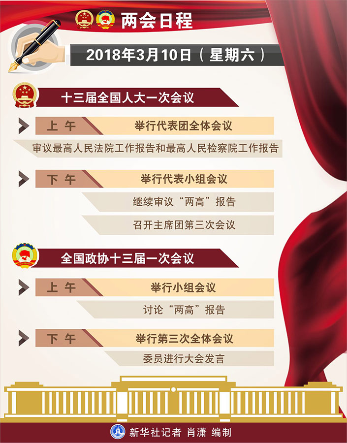 新華社北京3月9日電 十三屆全國(guó)人大一次會(huì)議10日上午舉行代表團(tuán)全體會(huì)議,審議最高人民法院工作報(bào)告和最高人民檢察院工作報(bào)告。下午舉行代表小組會(huì)議,繼續(xù)審議“兩高”報(bào)告,召開主席團(tuán)第三次會(huì)議。
