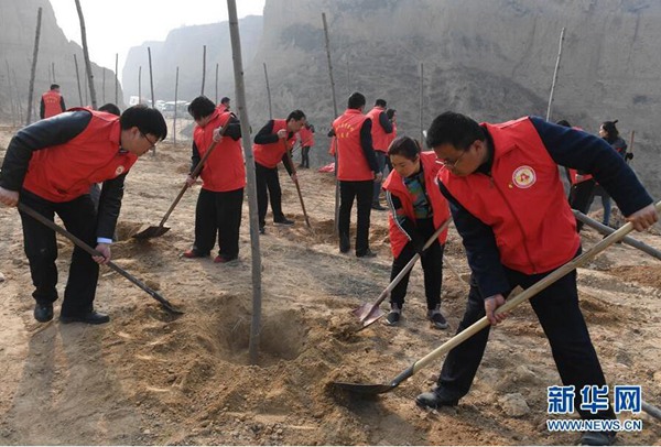 3月12日,山西省運城市稷山縣學(xué)雷鋒志愿者協(xié)會的志愿者們在荒山綠化點義務(wù)植樹。 新華社發(fā)(栗盧建 攝)