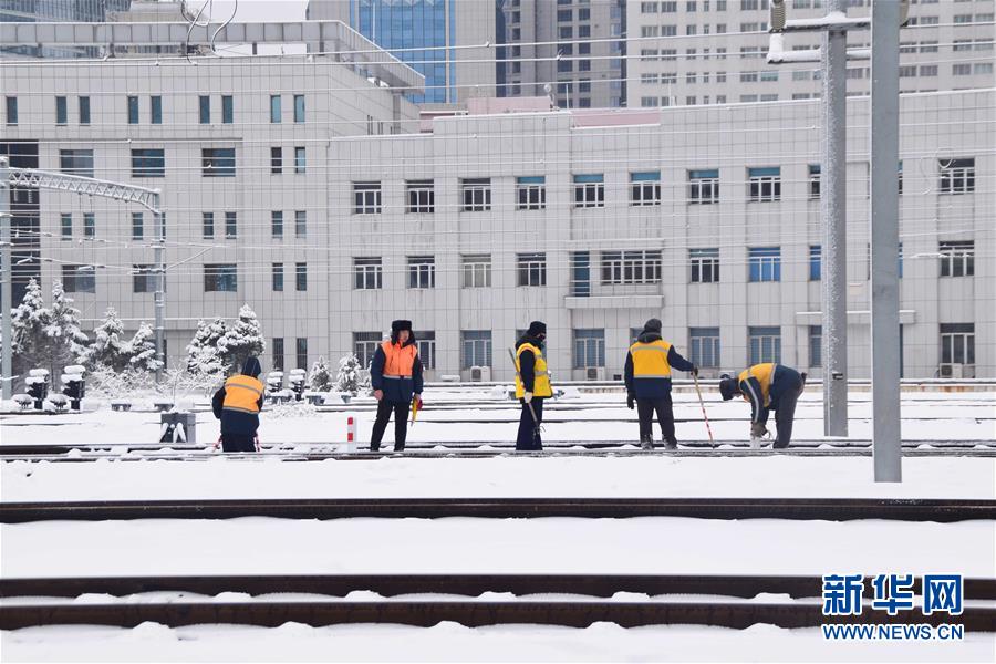 3月15日,沈陽北站的工作人員在清理鐵軌上的積雪。當日,沈陽降落春雪。新華社發(龍雷攝)