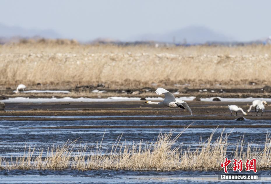3月20日,天鵝飛過湖面。日前,內蒙古自治區呼倫貝爾市陳巴爾虎旗陸續迎來大量北歸天鵝。據了解,每年四月份,成群的天鵝從中國南方遷徙到呼倫貝爾產卵繁殖,而今年三月中旬起,陳巴爾虎旗境內便迎來大量回歸天鵝,實屬罕見。中新社記者 武軍 攝
