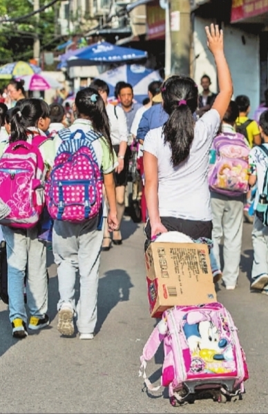武漢市武昌區,小學生們拖著沉重的書包放學回家。新華社記者 肖藝九攝