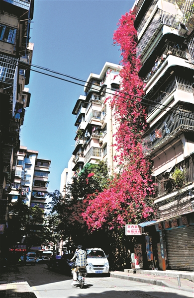 從街口望去,緋紅色的簕杜鵑“瀑布”。
