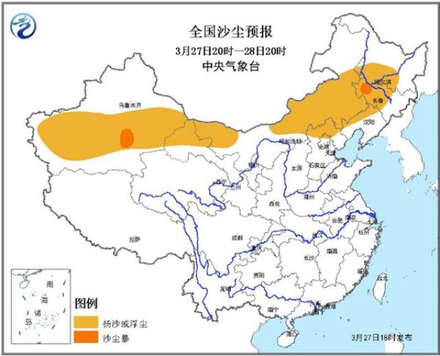 預計27日20時至28日20時,受大風天氣影響,新疆南疆盆地、內蒙古、甘肅西部、遼寧西北部、吉林西部、黑龍江西南部、河北北部、北京北部等地的部分地區有揚沙或浮塵天氣,其中新疆南疆盆地、吉林西部等地局部有沙塵暴。