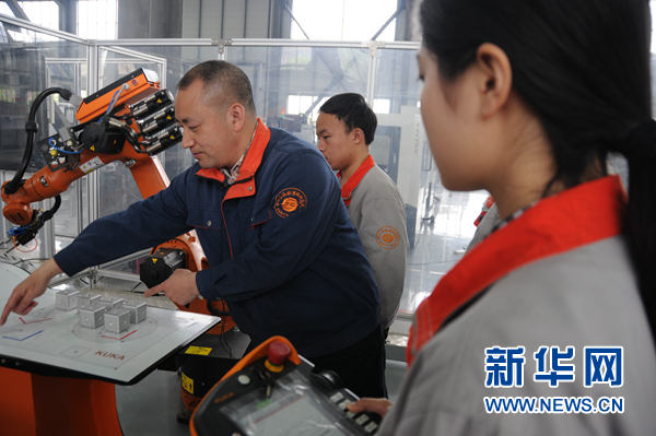 胡明華在機器人應用工程實驗室里指導學生們進行機器人操作學習。新華網 聶晨靜 攝