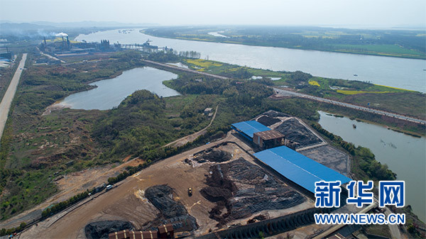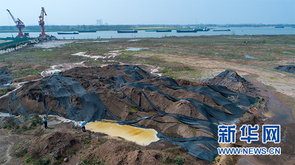 這是3月29日用無人機拍攝的安徽貴池前江工業園內池州恒鑫材料科技有限公司廠區內的長江堤岸旁傾倒的選礦尾渣。新華社記者 郭晨 攝