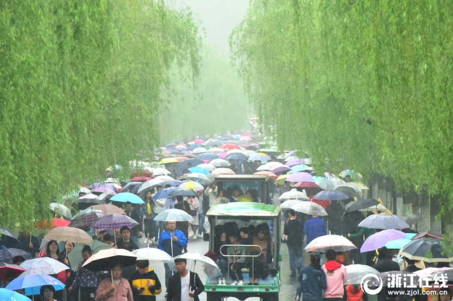4月5日,清明小長假首日,杭州細雨綿綿,西湖景區游客絡繹不絕。杭城雖降雨降溫,但西湖景區前來賞花踏青的游客如潮,斷橋似人橋。(浙江在線拍友 里爾 柱子 攝)