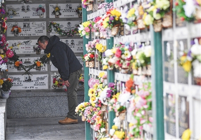 4月5日,市民前往萬安公墓祭奠。將骨灰盒放入墻內骨灰格的立體安葬方式,成為眾多家庭的選擇。新京報記者 陶冉 攝