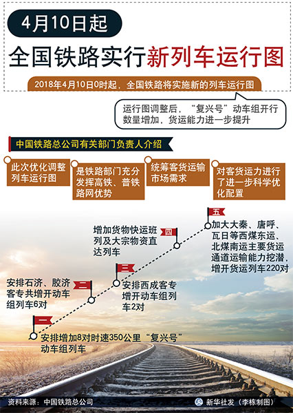 2018年4月10日0時起,全國鐵路將實施新的列車運行圖。運行圖調整后,“復興號”動車組開行數(shù)量增加,貨運能力進一步提升。新圖實施后,北京至上海間通過壓縮停站,實現(xiàn)最快4小時18分可達,較調圖前壓縮6分鐘。>>>