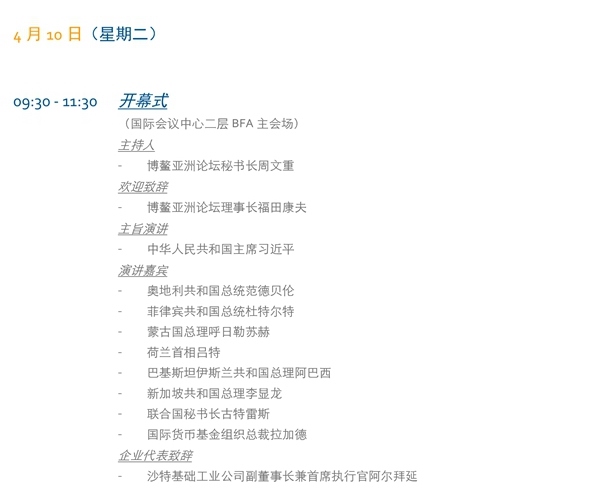 據(jù)博鰲亞洲論壇官網(wǎng)公布的會議日程,4月10日上午舉行年會開幕式