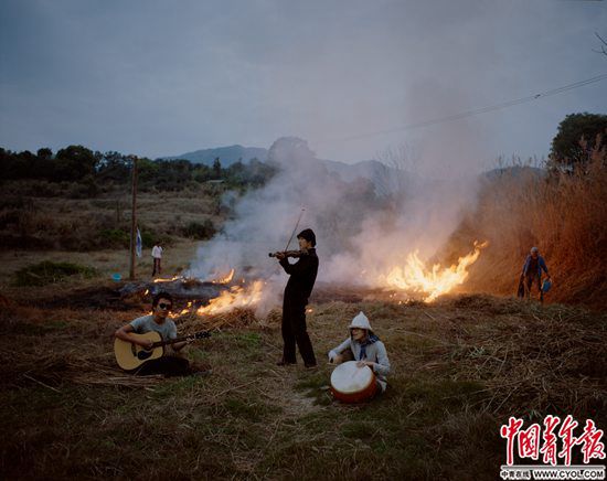 3月14日傍晚,福建省福州市閩侯縣關中村,“南部生活”共識社區成員在墾荒前將蘆葦和野草燒掉,日本建筑師吉富遙樹、社區發起人唐冠華和邢振(左至右)見到燒荒的場景,臨時起意來到現場演奏。