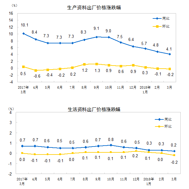 2018年3月份,全國工業(yè)生產(chǎn)者出廠價(jià)格同比上漲3.1%,環(huán)比下降0.2%。工業(yè)生產(chǎn)者購進(jìn)價(jià)格同比上漲3.7%,環(huán)比下降0.3%。一季度,工業(yè)生產(chǎn)者出廠價(jià)格同比上漲3.7%,工業(yè)生產(chǎn)者購進(jìn)價(jià)格同比上漲4.4%。