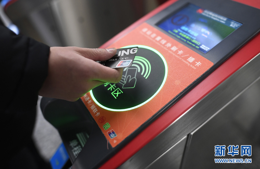 乘客在杭州地鐵豐潭路站體驗使用帶有閃付功能的銀聯IC卡過閘乘車(2017年12月27日攝)。新華社記者 黃宗治 攝