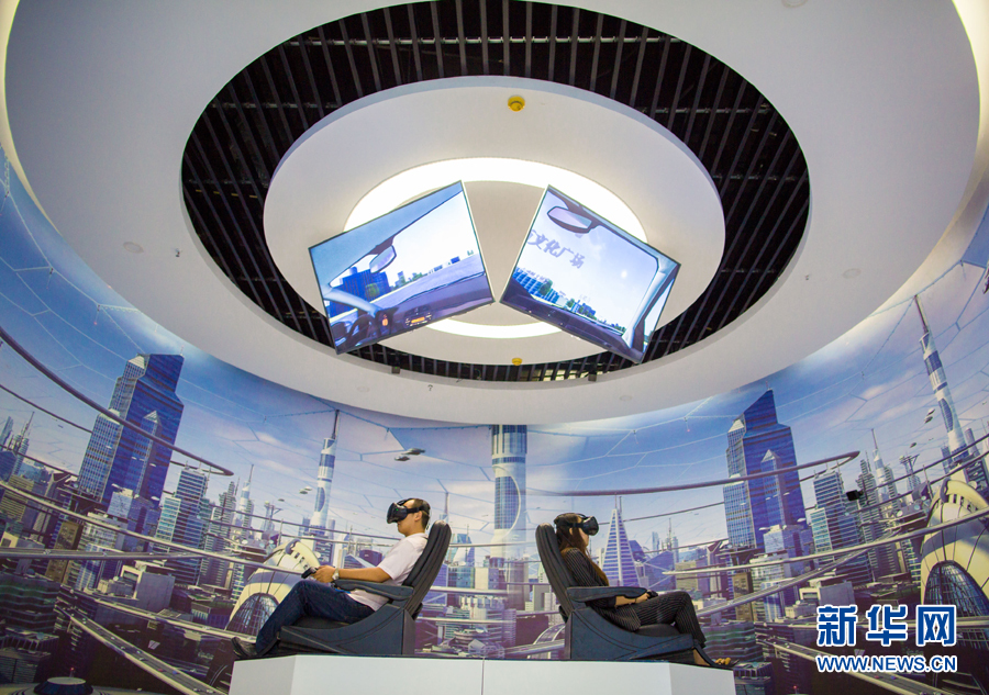 市民在內蒙古呼和浩特玉泉區大數據應用產業基地體驗VR眼鏡(2017年8月1日攝)。新華社發(丁根厚 攝)