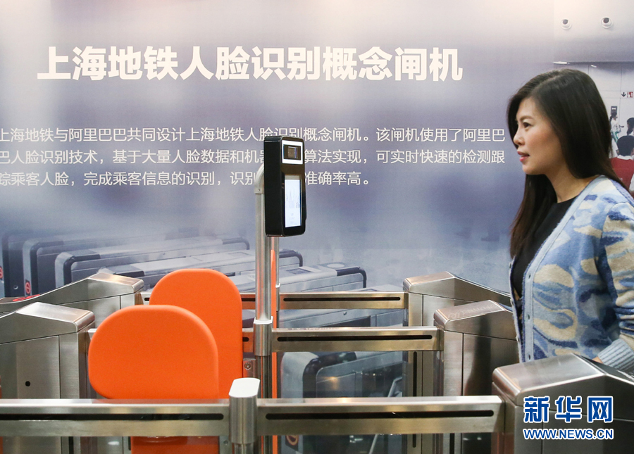 在上海申通地鐵集團有限公司,工作人員在現場體驗刷臉進站技術(2017年12月5日攝)。新華社記者 丁汀 攝