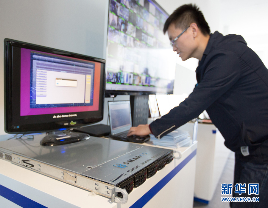 在北京智能計算產業研究院舉行的發布會上,工作人員在現場演示高通量人工智能一體機的實際應用(2017年12月6日攝)。新華社記者 金立旺 攝