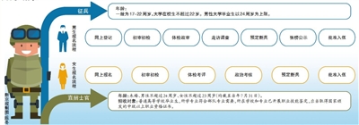 男青年應(yīng)征需經(jīng)過(guò)網(wǎng)上登記、初審初檢、體檢政審、走訪調(diào)查、預(yù)定新兵、張榜公示、批準(zhǔn)入伍7個(gè)環(huán)節(jié)。
