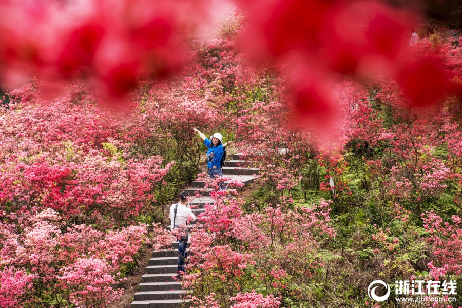 4月21日,全國森林旅游示范縣、浙中杜鵑谷——磐安縣盤峰鄉(xiāng)高姥山核心區(qū)塊的2000多畝各色杜鵑競相爭艷,滿山遍野杜鵑姿態(tài)萬千,花團錦簇,身臨其中,宛如置身仙境。(浙江在線拍友 陳溢之 攝)