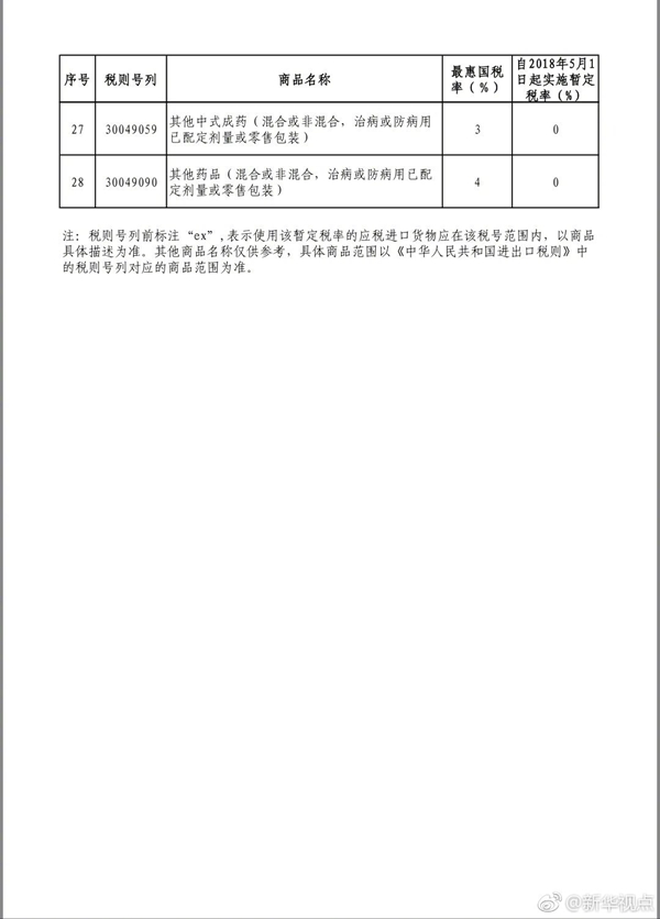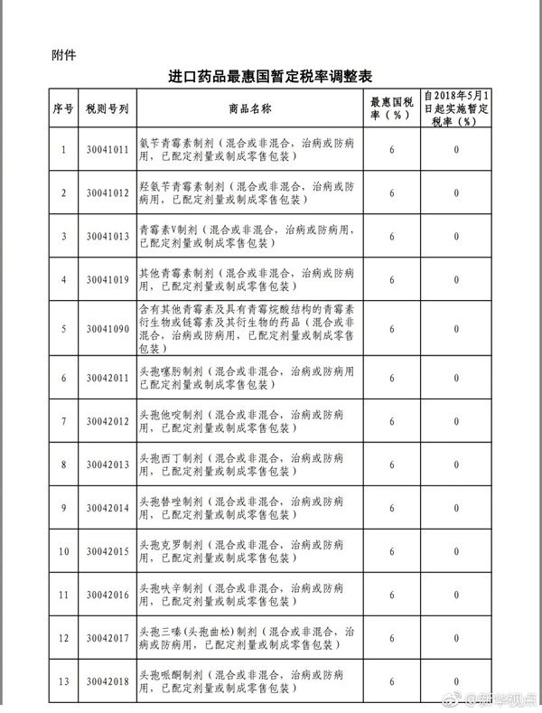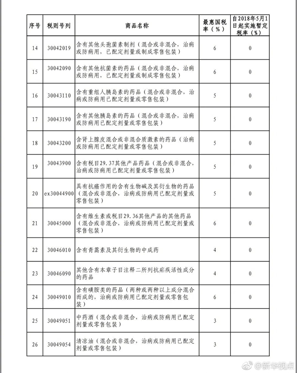 新華網(wǎng)北京4月23日電 財政部關稅司23日發(fā)布消息,5月1日起我國將取消包括抗癌藥在內的28項藥品進口關稅。調整后,除安宮牛黃丸等我國特產(chǎn)藥品、部分生物堿類藥品等少數(shù)品種外,絕大多數(shù)進口藥品,特別是有實際進口的抗癌藥均將實現(xiàn)零關稅。(記者郁瓊源) ????(據(jù)新華社“新華視點”微博報道)?