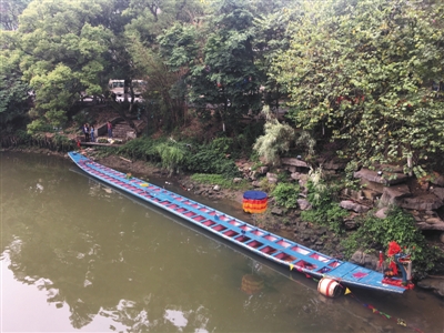 昨日,距翻船事故發(fā)生地百余米外,一艘龍舟停在桃花江邊。