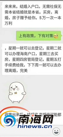4月22日晚,海南省政府召開《中共海南省委辦公廳海南省人民政府辦公廳關(guān)于進(jìn)一步穩(wěn)定房地產(chǎn)市場的通知》新聞發(fā)布會,公布全省實施全域限購。隨即,朋友圈流傳“星期一登記結(jié)婚、星期二辦理海南戶口、星期三買房、星期四登記(結(jié)婚)、星期五打(假結(jié)婚)手續(xù)費、下周一離婚”等傳言和段子。南海網(wǎng)記者從海南省公安廳、海口市民政局等部門了解到,此類登記結(jié)婚就可立即辦理落戶海南等傳言均不可能實現(xiàn)。