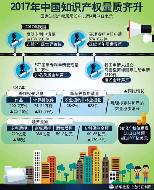 隨著中國經濟迅速發展和創新能力的提高,加強知識產權保護愈加顯得迫切。對此,不僅外資企業有要求,中國企業更有要求。2017年,中國國家知識產權局共受理發明專利申請138.2萬件,其中國內申請超過90%;商標申請量達到574.8萬件,其中國內申請量占到96.36%,顯示了國內市場主體和創新主體對加強知識產權保護的強烈需求。