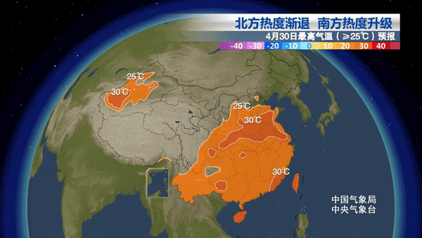 預計到明天白天,最高氣溫30℃以上區域將會集中在華南,福建東部和南部、廣東大部、廣西南部、海南島等地,而淮河以北大部地區最高氣溫將會不到25℃。